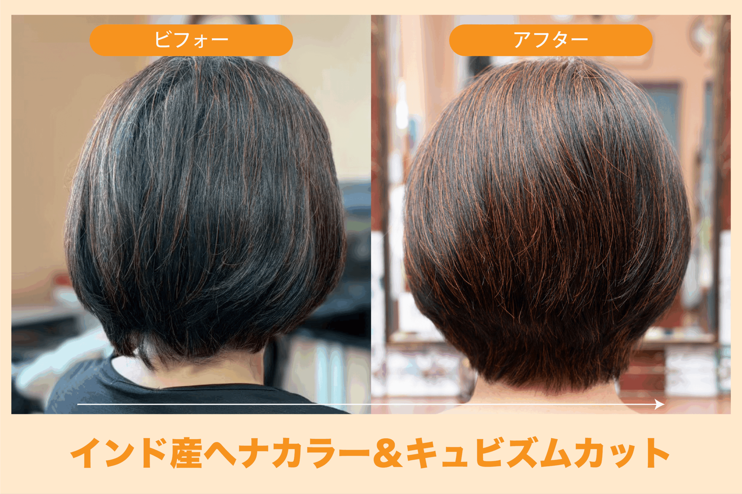 縮毛矯正しないで、キュビズムカットと沖縄産ヘナカラーで髪質改善 電子トリートメントで髪の艶、ダメージ回復