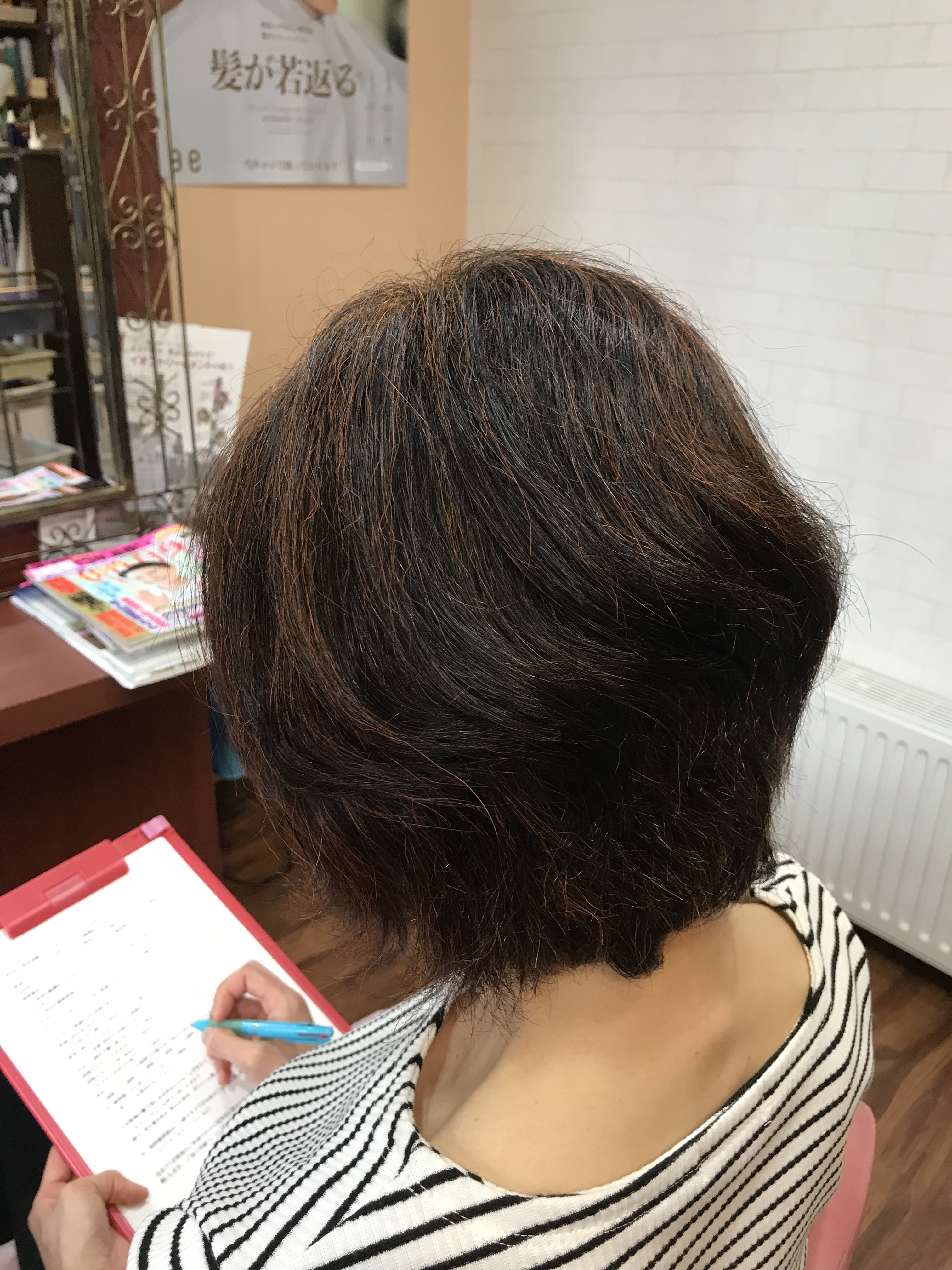 ご自分で市販のヘナカラーを購入されセルフヘナをしていましたが、『髪の質感が変わりますよ』というお話をして、当店で扱っている