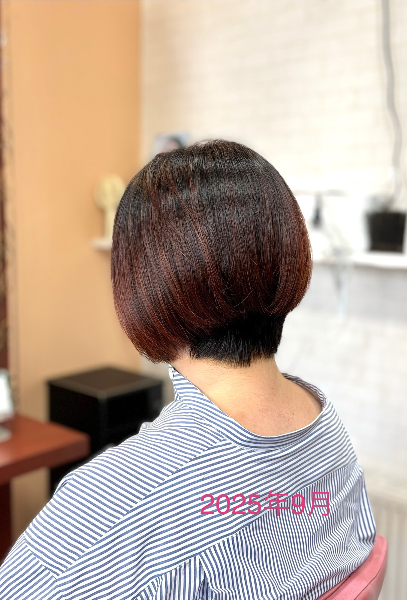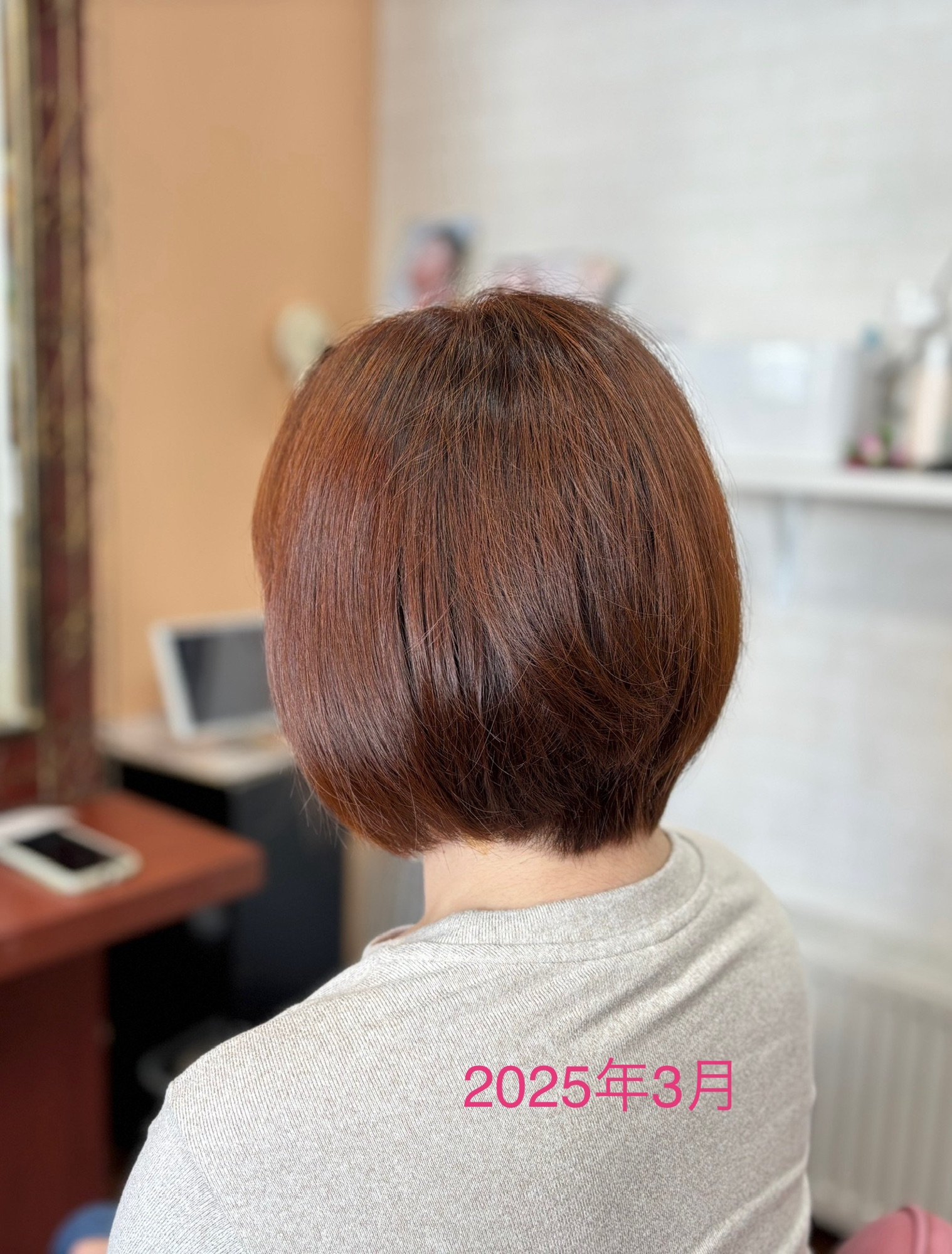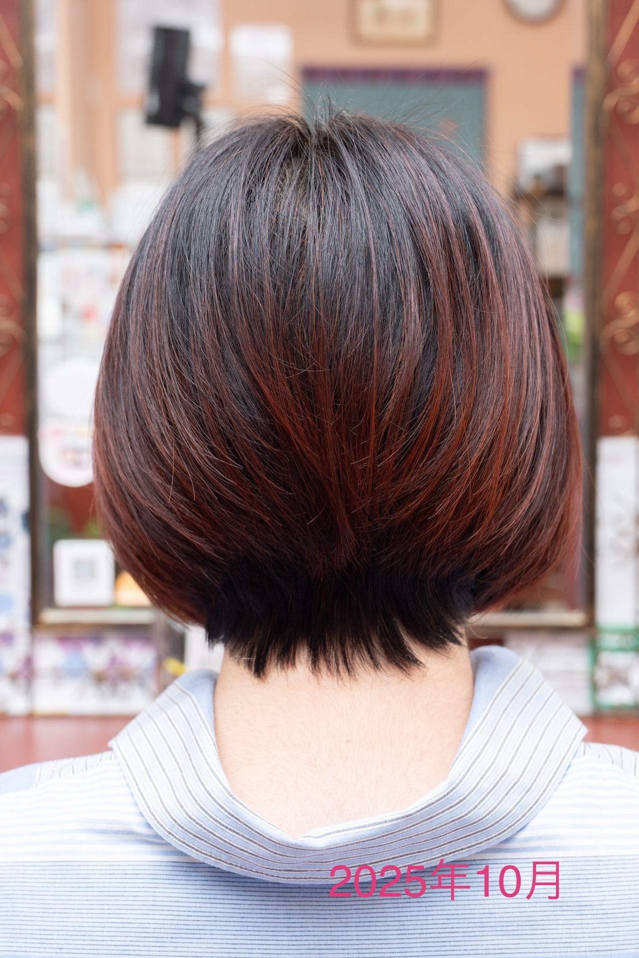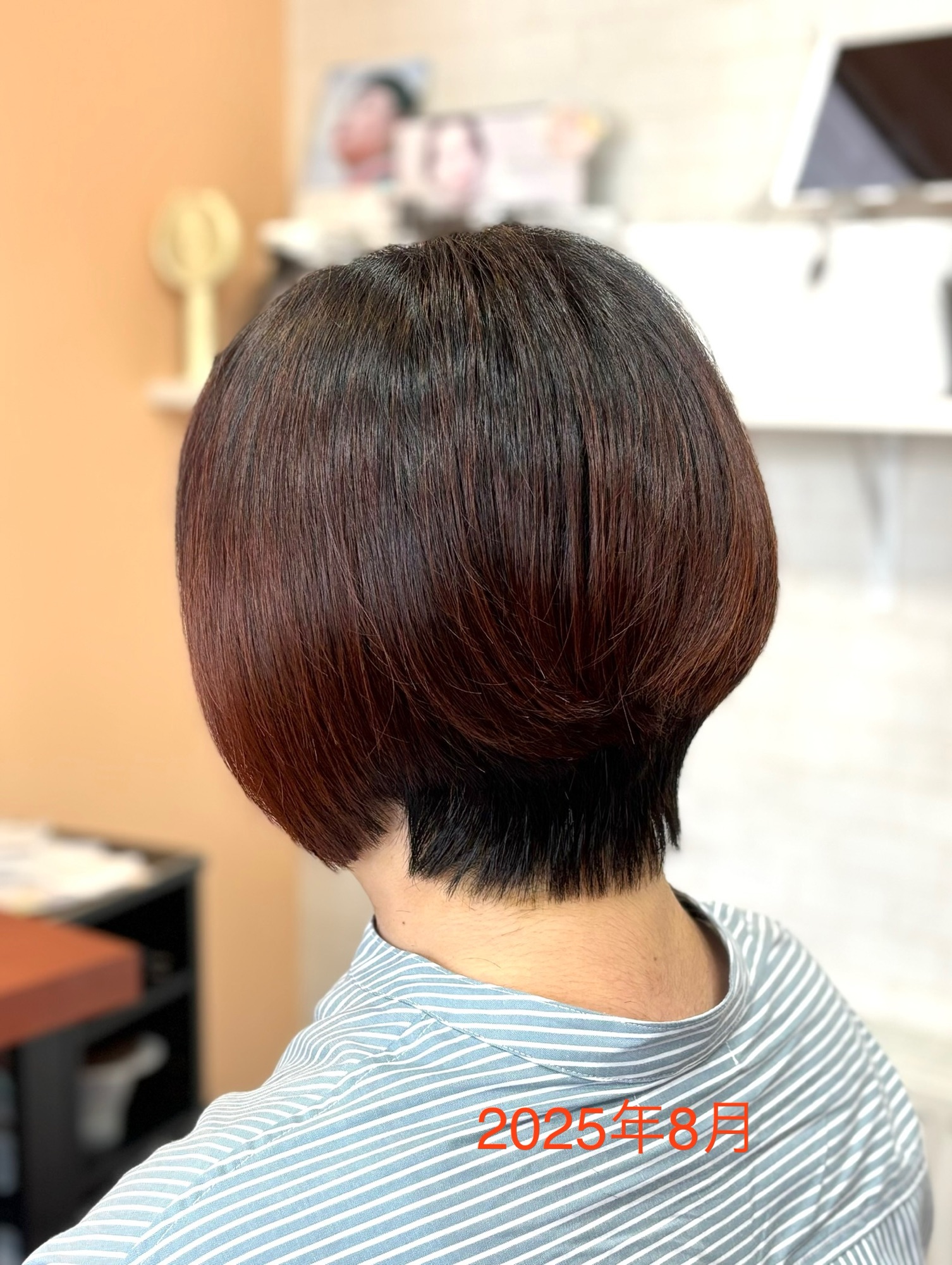 フロント、サイドの部分の白髪のところがメッシュを入れたように、色が立体感を出してヘアスタイルとよくマッチしてきました♪。