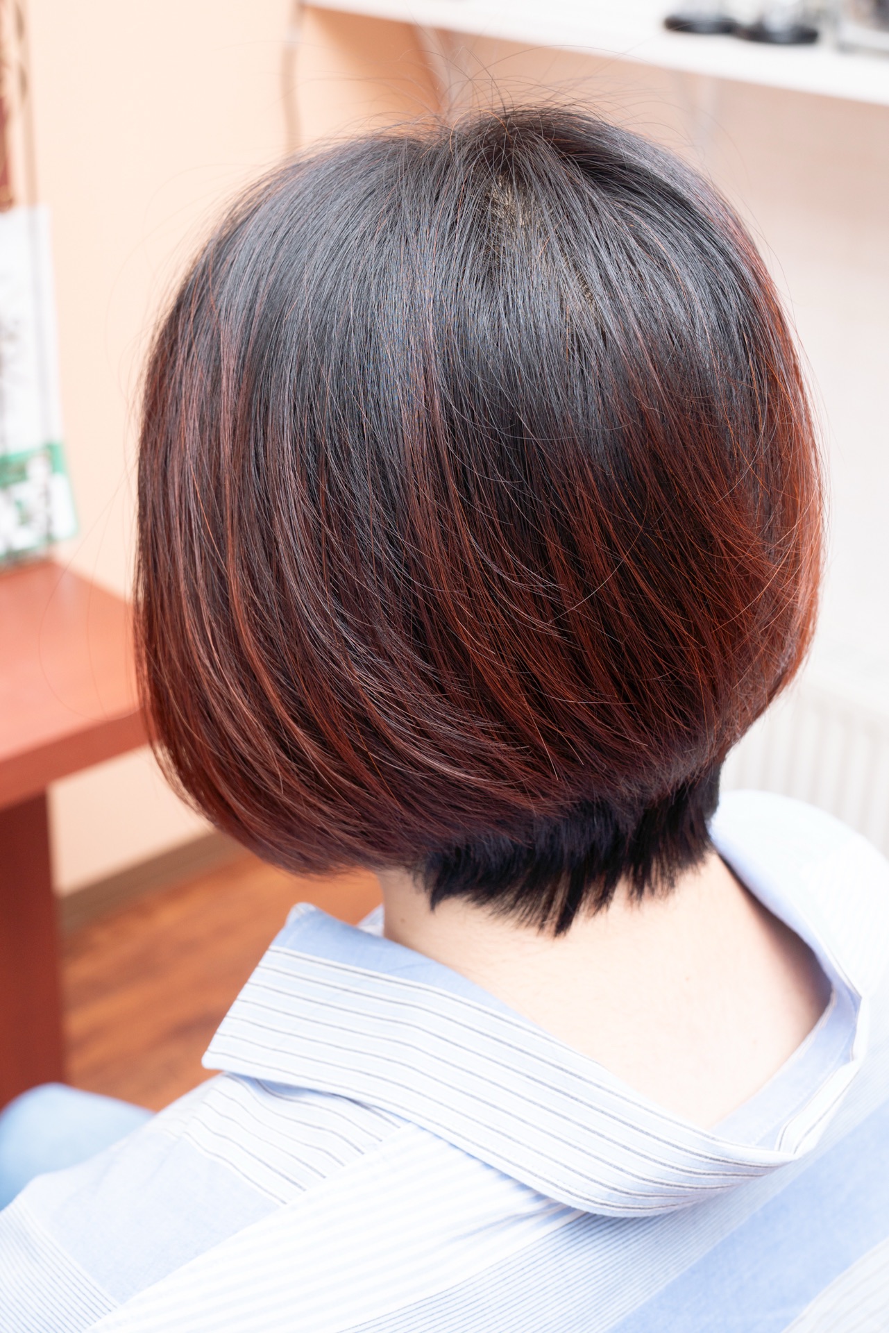 以前に染めていたところが明るく残っているので、そこにヘナカラーの色を乗せると深みのある色になっています。