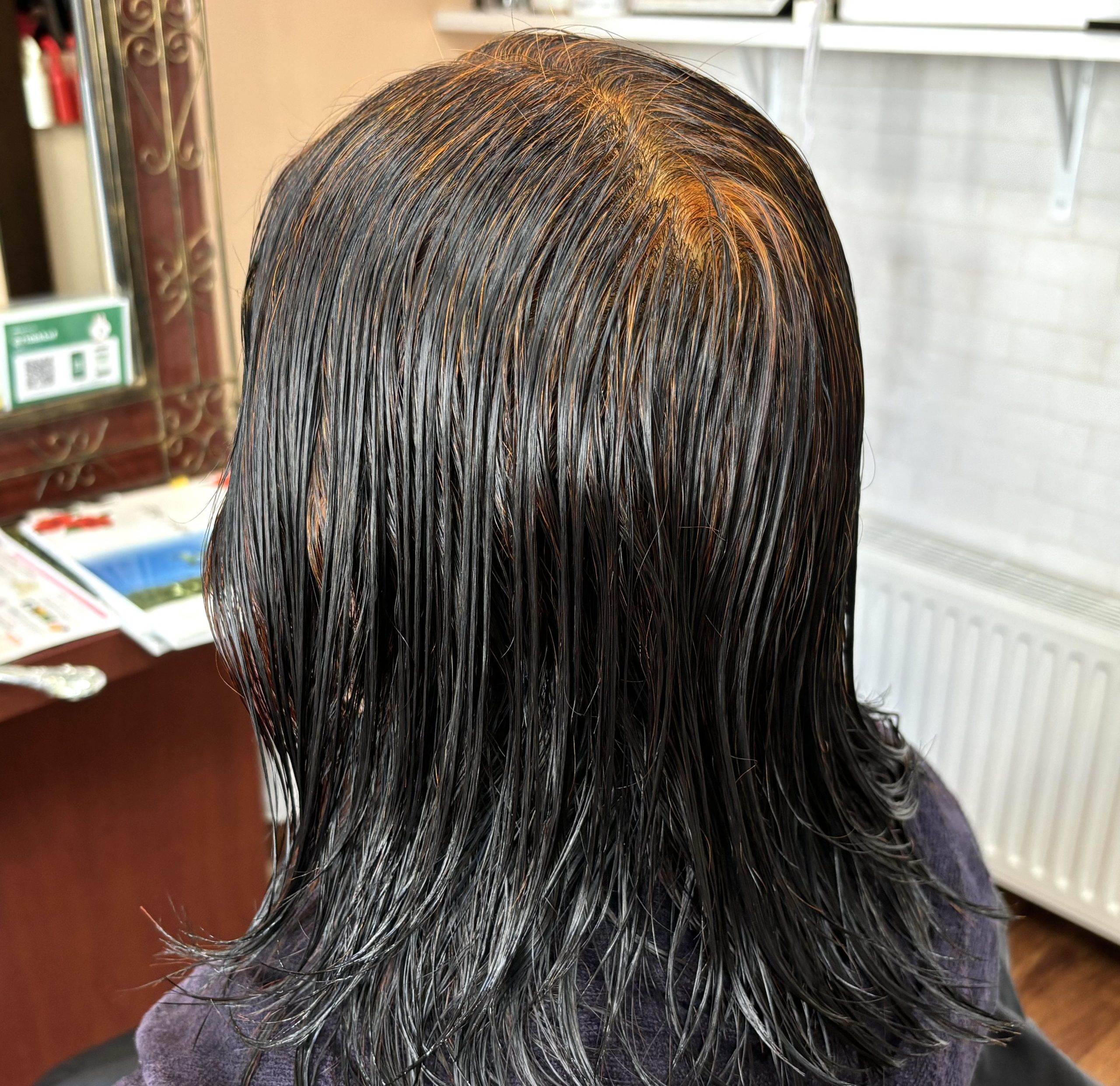 沖縄産ヘナカラー100%で1時間放置後、洗い流した状態です