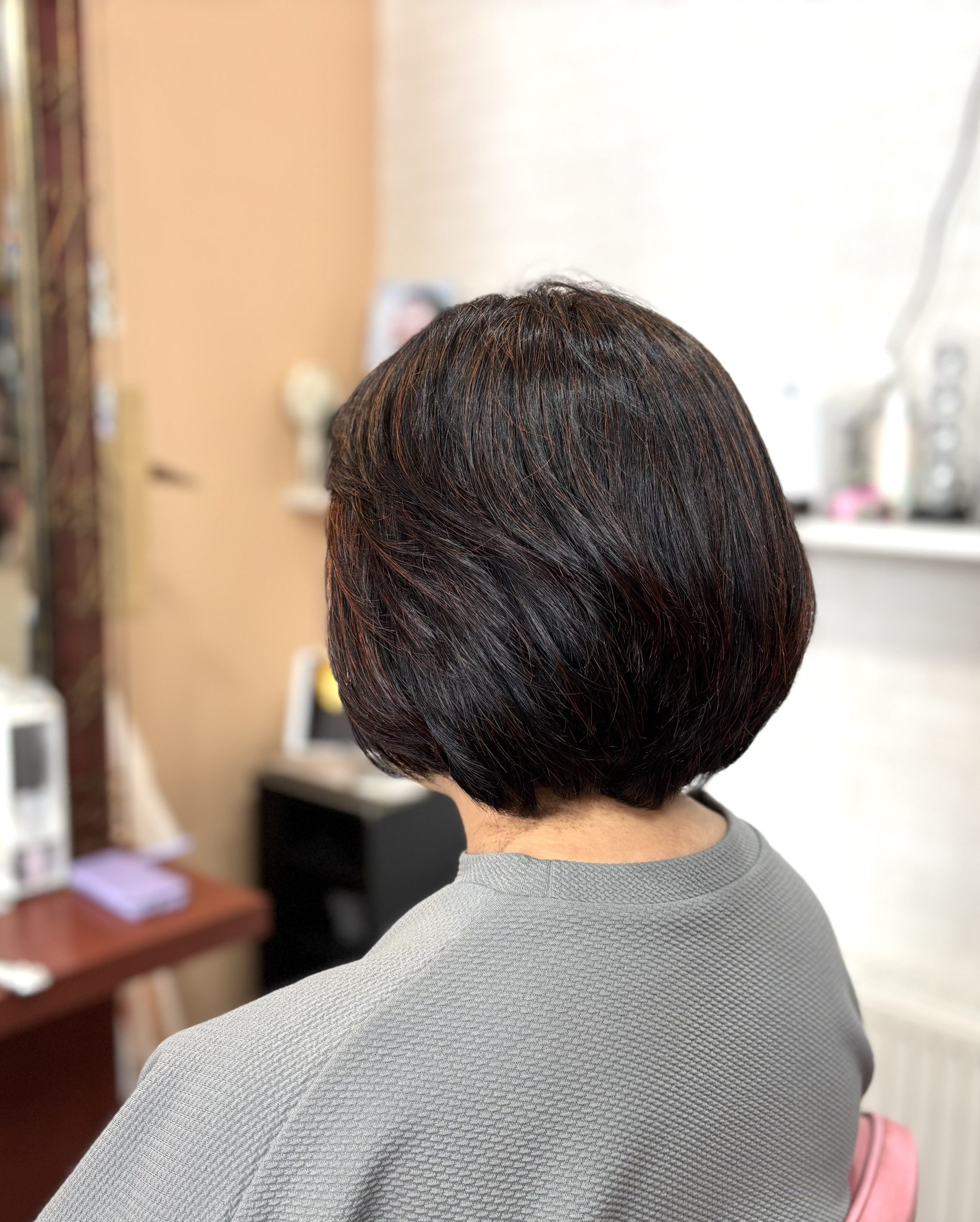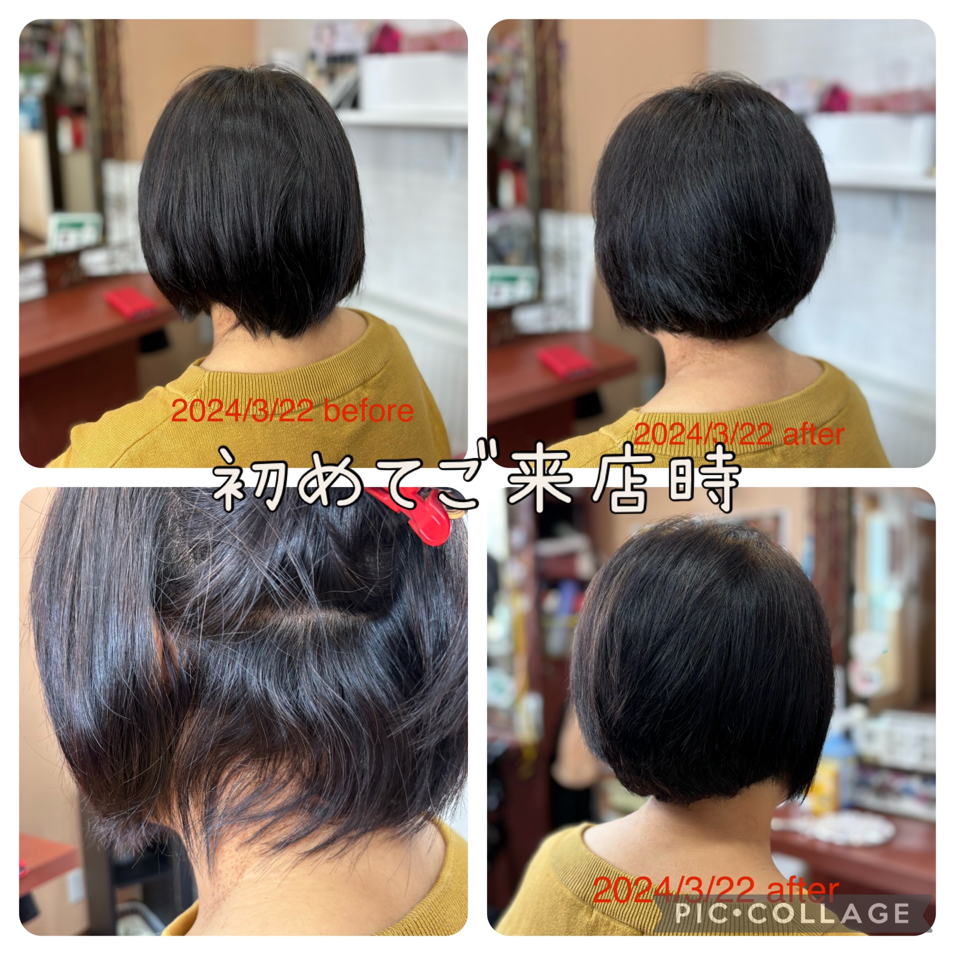 キュビズムカットで✂️お客様のご希望によりあまり短くは、したくないので、少しずつ修正しながら、沖縄産ヘナカラーとの併用で髪質を改善